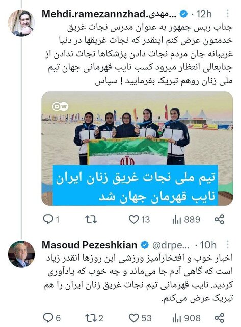 به گزارش ایسنا، مسعود پزشکیان در حساب کاربری خود در شبکه اجتماعی ایکس در واکنش به مخاطبی که در کامنت پیام تبریک رئیس‌جمهور برای سعید افروز نوشته بود «جناب رئیس‌جمهور به عنوان مدرس نجات غریق خدمتتون عرض می کنم انقدر که نجات غریق‌ها در دنیا غریبانه جان مردم را نجات دادند پزشک ها نجات ندادند از جنابعالی انتظار می رود که کسب نایب قهرمانی جهان تیم ملی زنان را هم تبریک بفرمایید! سپاس»، نوشت: اخبار خوب و افتخارآمیز ورزشی این روزها آنقدر زیاد است که گاهی آدم جا می ماند و چه خوب که یادآوری کردید. نایب قهرمانی تیم نجات غریق زنان ایران را هم تبریک می گویم.».